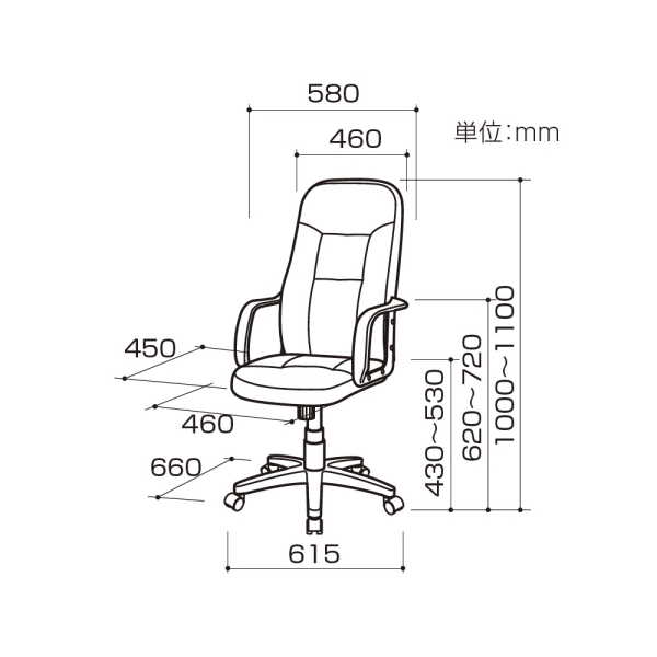 本革のような風合いのPVCレザー採用。座面/背もたれ連動ロッキング機構付。ガススプリング上下昇降機構付。