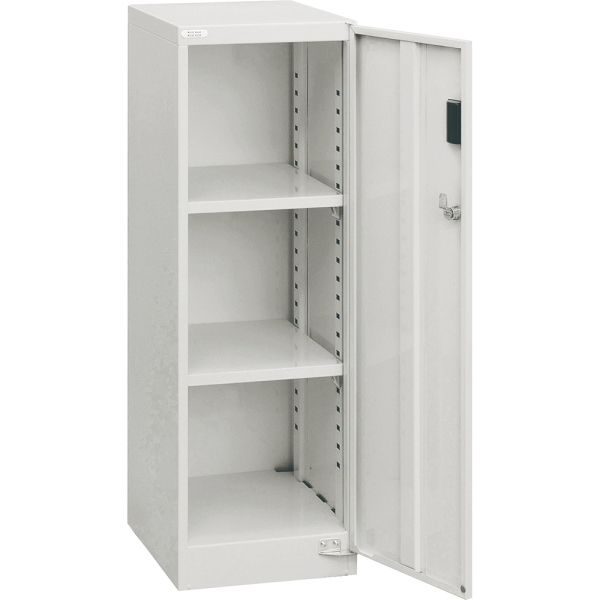 『カギ付き扉』で情報流出をシャットアウト。扉&カギ付きフロアケースの棚板タイプ。オフィス内の備品や小物の保管に。
