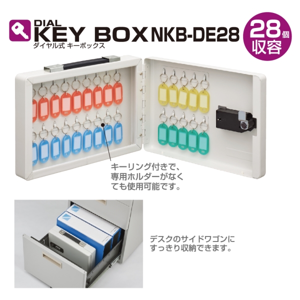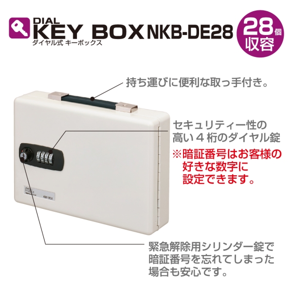 キーリング付きで、専用ホルダーがなくても使用可能です。持ち運びに便利な取っ手付き。緊急解除用シリンダー錠で暗証番号を忘れてしまった場合も安心です。セキュリティー性の高い4桁のダイヤル錠。